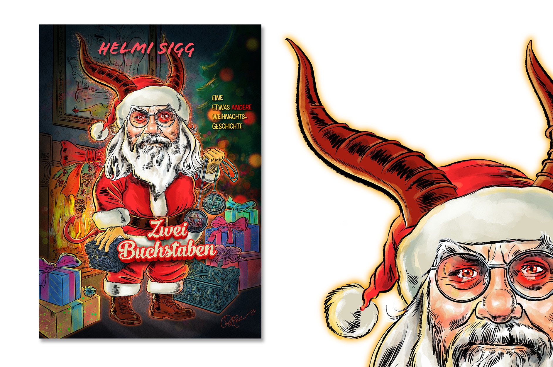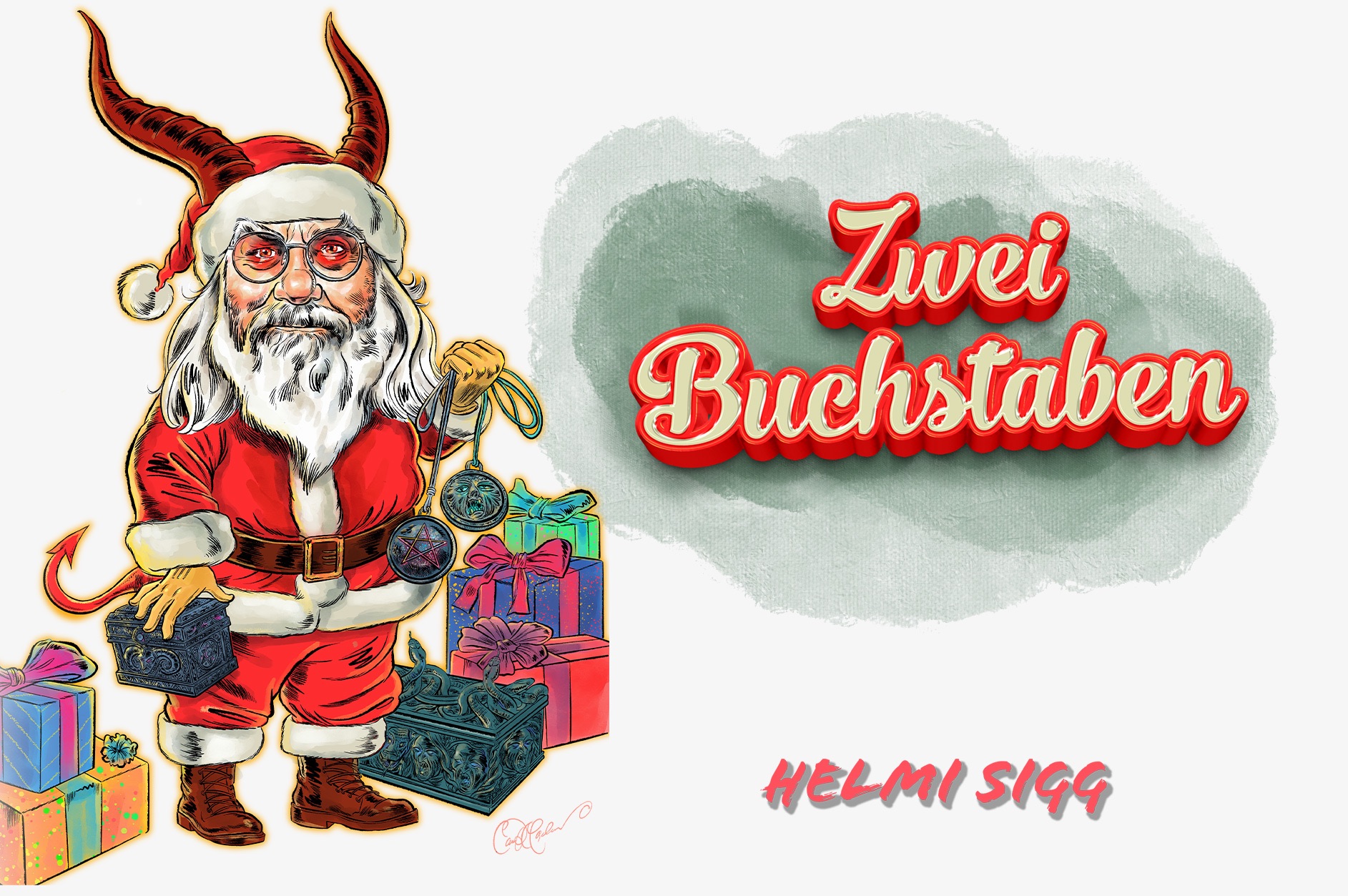 In der Erzählung verwechselt ein Kind zwei Buchstaben – mit weitreichenden Folgen. Das Motiv für das Cover greift klassische Weihnachtssymbole auf, kombiniert mit einem ironisch-doppelbödigen Twist. Ganz im Stil von HelmIs Text zeigt das Bild einen Weihnachtsmann mit Hörnern – ein Augenzwinkern, das zum Nachdenken anregt.