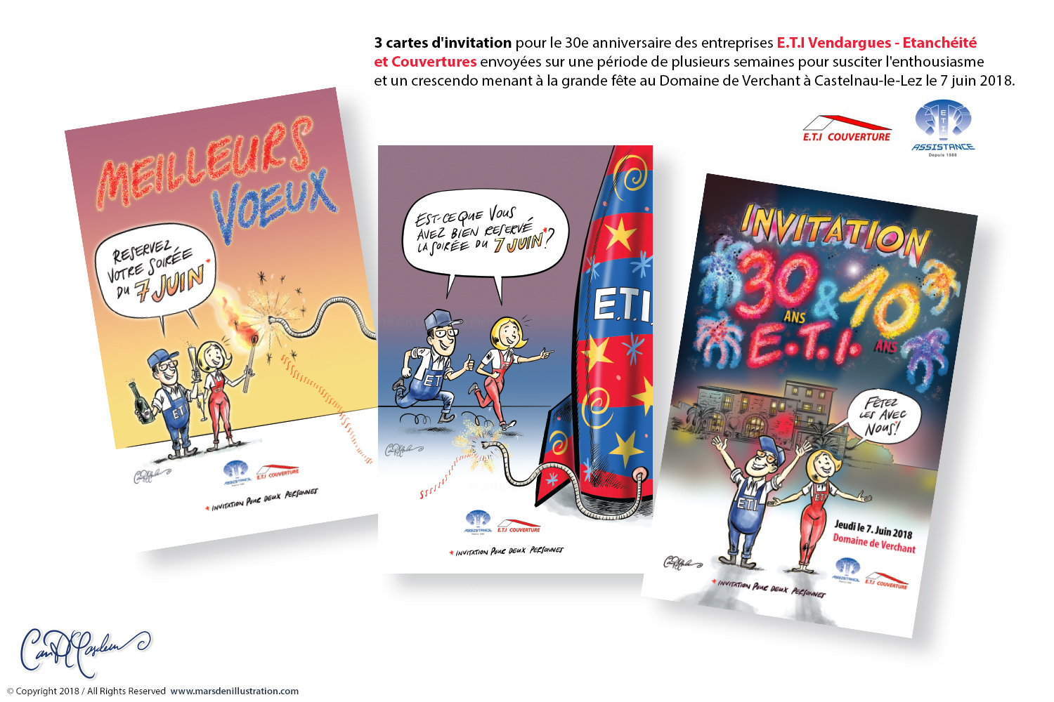 L’idée et la conceptualisation, les croquis bruts et ensuite le travail artistique final pour 3 cartes d’invitation pour le 30e et 10e anniversaire des entreprises E.T.I Vendargues – Etanchéité et Couvertures envoyées sur une période de plusieurs semaines pour susciter l’enthousiasme et un crescendo menant à la grande fête au Domaine de Verchant à Castelnau-le-Lez le 7 juin 2018.