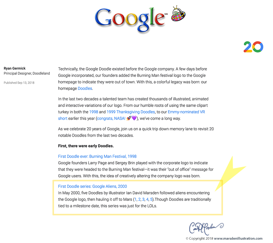 When Google celebrated 20 years of Google Doodles, I was deeply honored to be mentioned in their official retrospective. In the article, Google makes a clear distinction between the first Google Doodle (the original one-off from 1998) and the first Google Doodle series—a five-day sequence titled “Google Aliens, 2000.” In that “First Doodle series” entry, Google credits me by name as the illustrator.